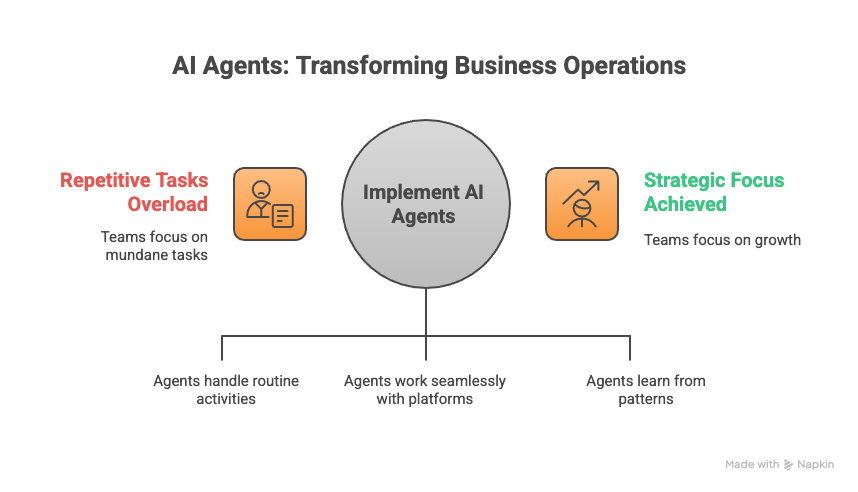 Every business has repetitive activities — responding to customer queries, scheduling tasks, analyzing reports, or monitoring systems. AI Agents step in as digital teammates, taking care of these activities so teams can focus on creativity and decision-making.