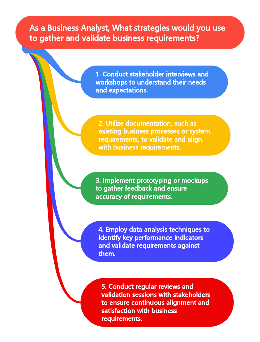 As a Business Analyst, What strategies would you use to gather and validate business requirements?