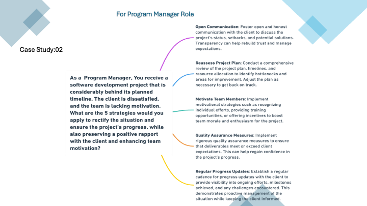 As a Program Manager, You receive a software development project that is considerably behind its planned timeline. The client is dissatisfied, and the team is lacking motivation. What are the 5 strategies would you apply to rectify the situation and ensure the project’s progress, while also preserving a positive rapport with the client and enhancing team motivation?
