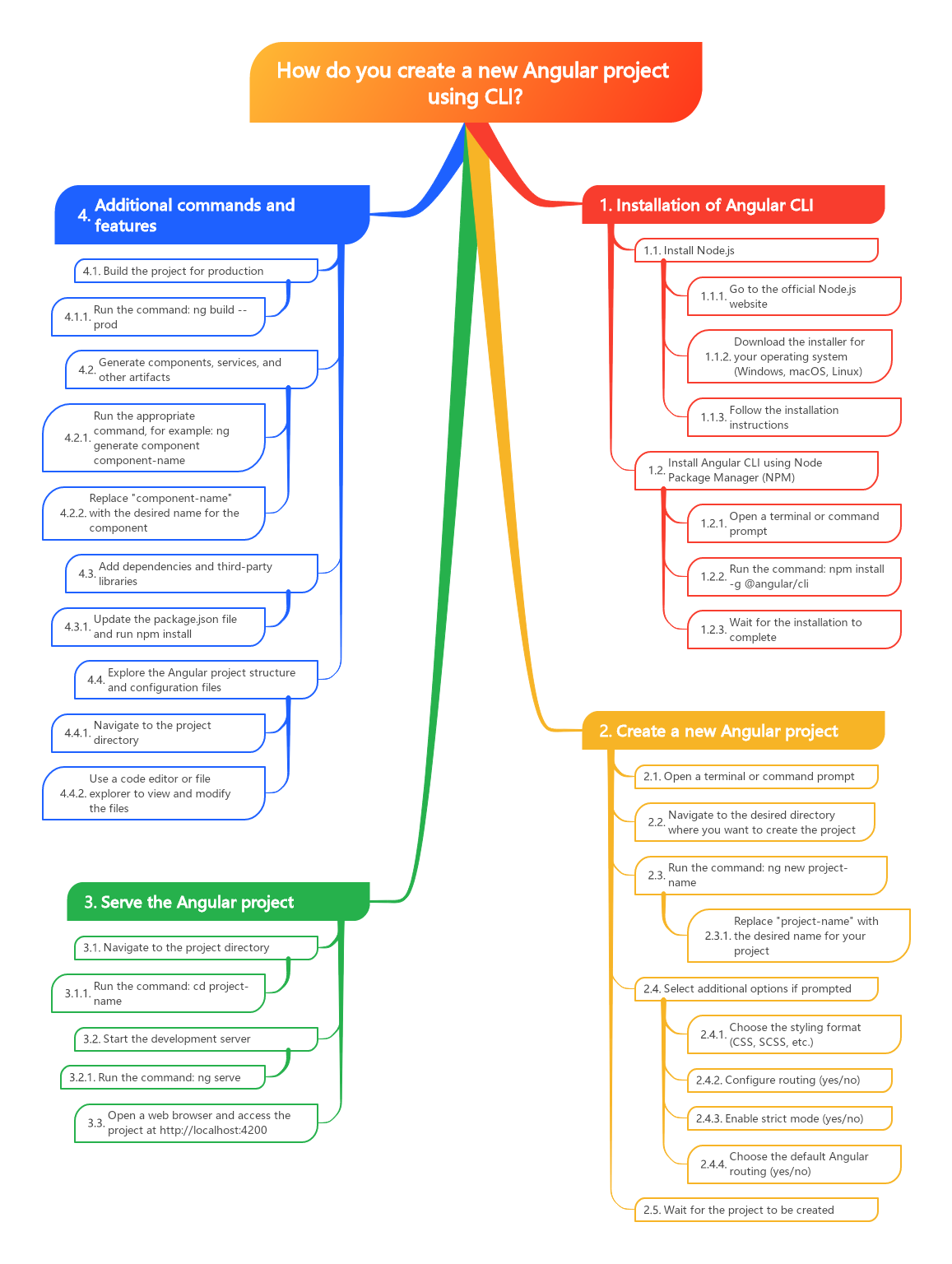 For example, if you wanted to create a new Angular project called “my-app”, you would run the command `ng new my-app` in the terminal. This will generate a new folder called “my-app” with all the necessary Angular files and dependencies installed, ready for you to start developing your application.