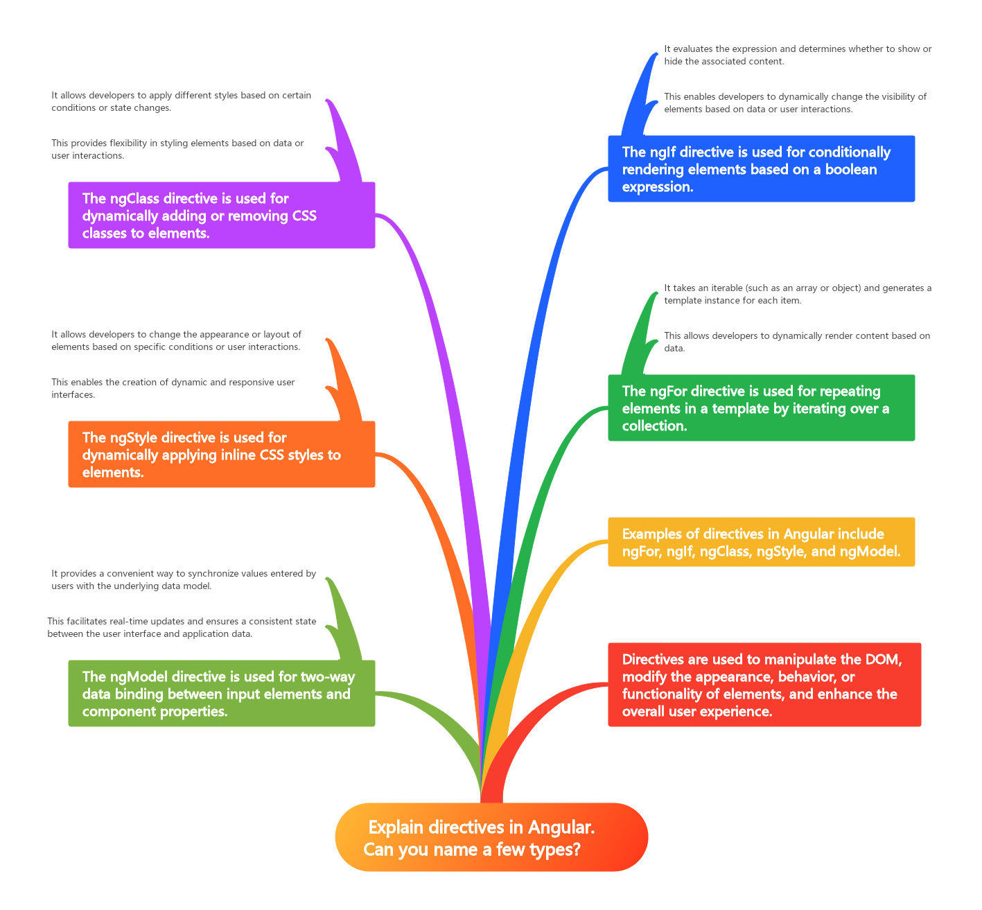 Examples: Examples of directives in Angular include ngFor, ngIf, ngClass, ngStyle, and ngModel.