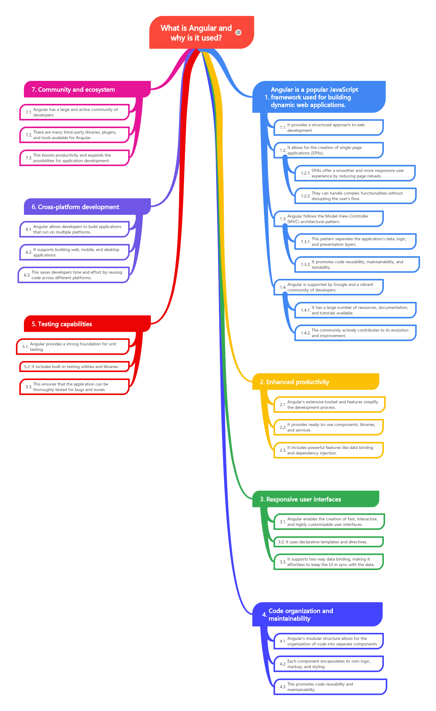 A major benefit of Angular is its ability to handle complex data models and bind data seamlessly. Its modular architecture encourages code reuse, making large projects easier to maintain. Angular also supports testing, making it easy for developers to verify their apps. Angular is a top choice for modern web development due to its robustness, performance, and community support.