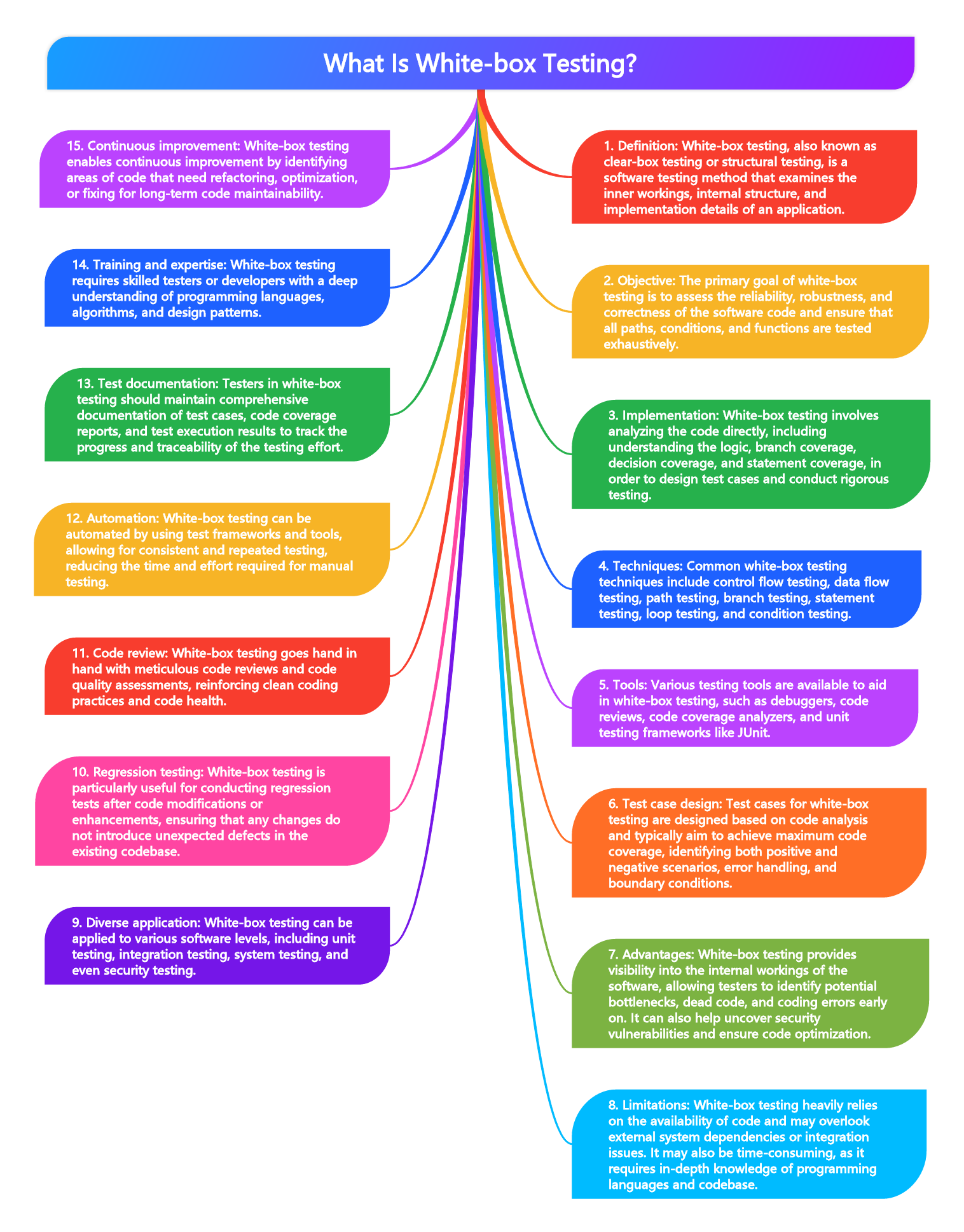 Definition: White-box testing, is also known as clear-box testing or structural testing, is a software testing method that examines the inner workings, internal structure, and implementation details of an application.
